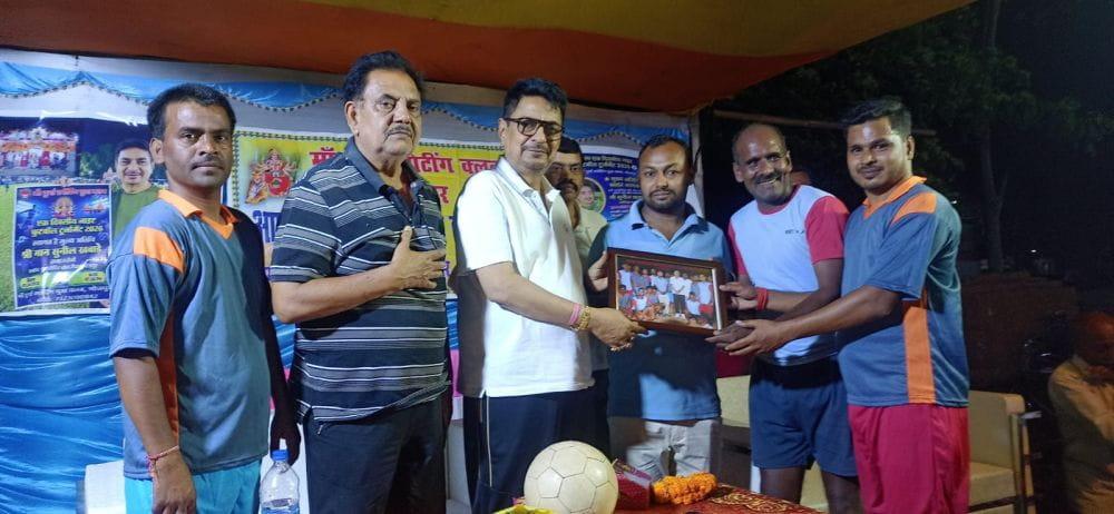 Deoghar. A night football tournament was organized on Monday at the Durga Temple ground in Bhojpur by Maa Durga Sporting Yuva Club. The event was inaugurated by District Olympic Association president Dr. Sunil Khawade, who interacted with players and kicked off the tournament.