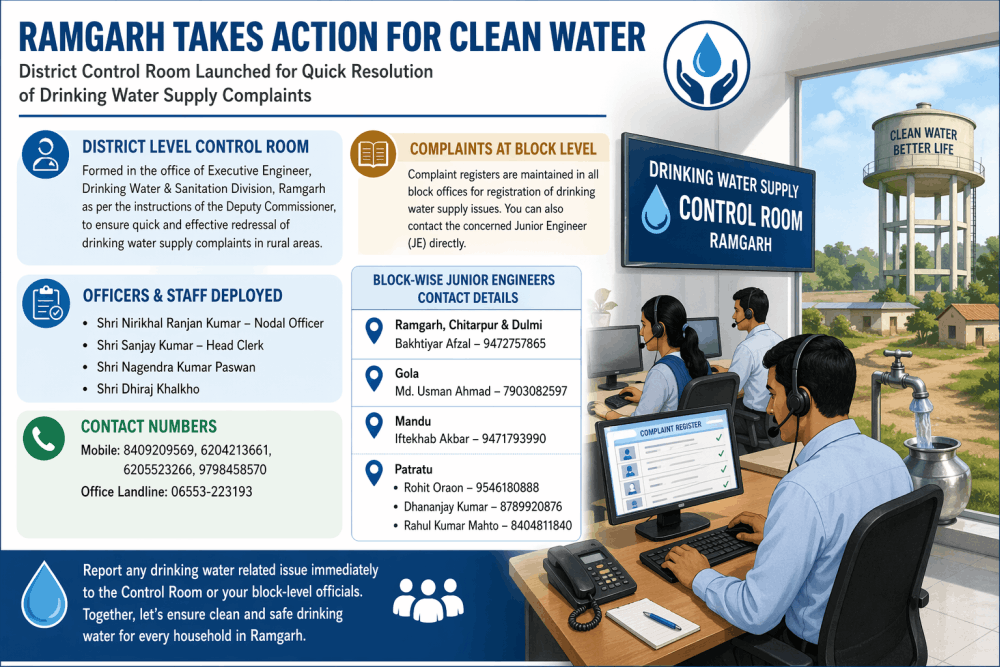 Ramgarh: In a move to address drinking water problems more efficiently, the district administration has set up a dedicated control room for quick grievance redressal in rural areas. The facility has been established at the office of the Executive Engineer, Drinking Water and Sanitation Division, Ramgarh, following directions from the Deputy Commissioner.