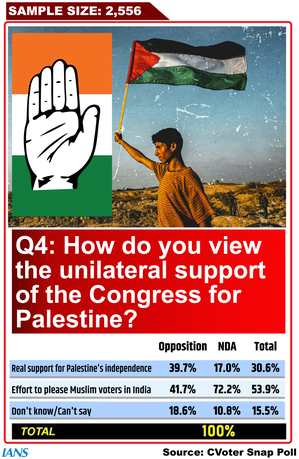 Interestingly, a higher proportion (42 per cent) of opposition supporters think the Congress is merely wooing the Muslim vote than those (40 per cent) who think the party genuinely cares for Palestine.