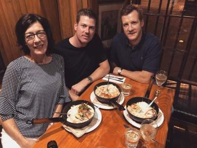 Australian cricketer James Faulkner having dinner with his mother Roslyn Carol Faulkner and his boyfriend of five years, Rob Jubb. (Photo: Instagram/jfaulkner44)