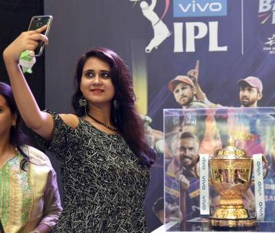 Kolkata: A woman poses for selfies with the IPL Trophy displayed at South City Mall during 2019 IPL trophy tour in Kolkata, on March 30, 2019. (Photo: Kuntal Chakrabarty/IANS)