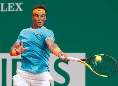 Roquebrune Cap Martin, April 21, 2019 (Xinhua) -- Rafael Nadal of Spain hits a return during the men's singles semifinal match against Fabio Fognini of Italy at the Monte-Carlo Rolex Masters tennis tournament in Roquebrune Cap Martin, France, April 20, 2019. Fabio Fognini won 2-0. (Xinhua/Nicolas Marie/IANS)