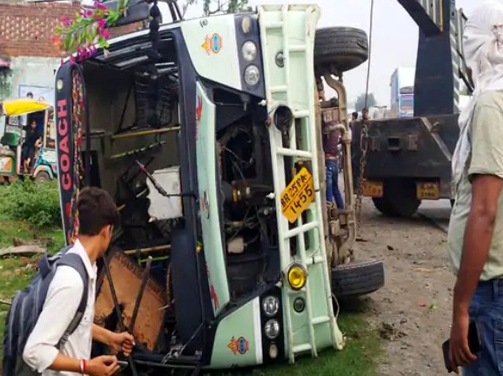 Due to the negligence of the new route, the bus suddenly lost its balance at the turning point and overturned at 3.40 am on Sunday. Due to which the front wheel collided with the divider and the tire blasted. The villagers informed the Chauparan police station and the ambulance.