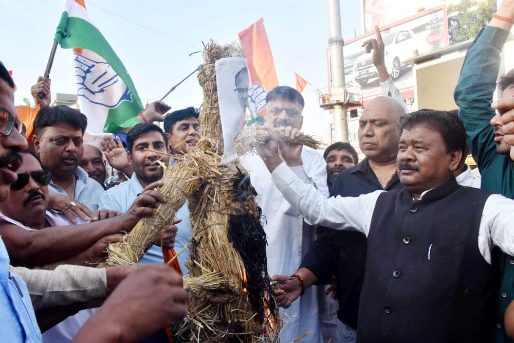 Ranchi: Jharkhand Pradesh Congress Committee (JPCC) President Rajesh Thakur along with working President Bandhu Tirkey and hundreds of party workers burned an effigy of Madhya Pradesh Chief Minister Shivraj Singh Chouhan at Albert Ekka Chowk in Ranchi on Wednesday.