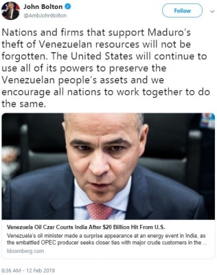 A tweet by United States National Security Adviser John Bolton threatening those doing business with Venezuela that shows a story about Venezuelan Oil Minister Manuel Quevedo's visit to India to promote oil sales to India. (Photo: Twitter)